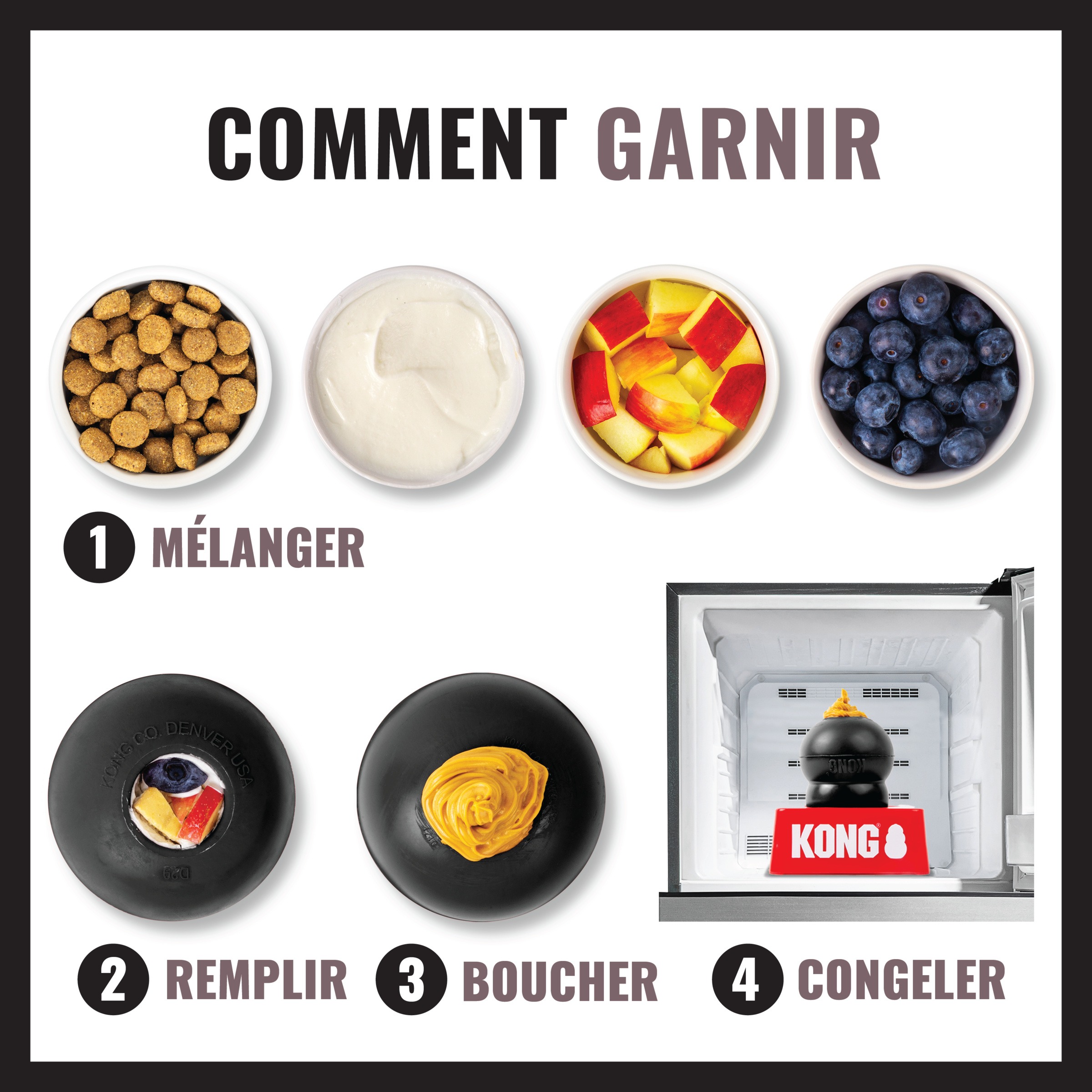 •Congelez-le garni des recettes préférés de votre chien pour un jeu prolongé